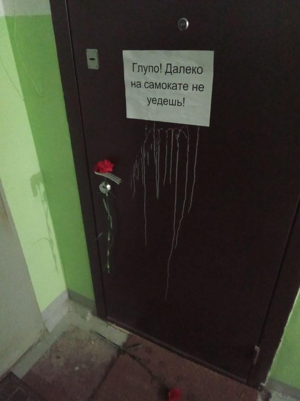 Однако 9 апреля на квартирную дверь Вайсенберга приклеили лист с фразой «Глупо! Далеко на самокате не уедешь», а за ручку засунули две гвоздики.