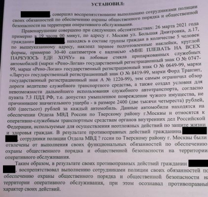 Тверской районный суд 6 апреля арестовал двоих активистов движения «СтопХам» на 7 и 10 суток по статье о воспрепятствовании законной деятельности сотрудников полиции (ч. 1 ст. 19.3 КоАП) из-за наклейки на полицейский автомобиль, который силовики припарковали с нарушением. Об этом ОВД-Инфо 15 апреля сообщил один из активистов, попросивший не публиковать его имя.