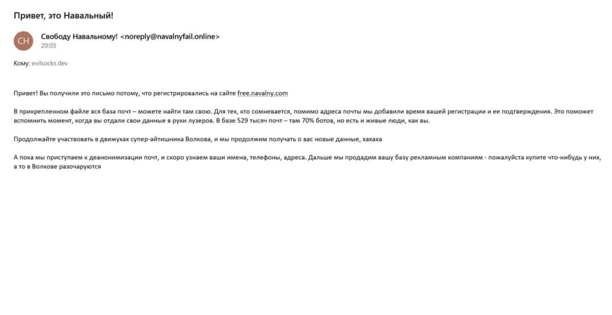 Директор ФБК* Иван Жданов также подчеркнул, что злоумышленники могли разослать сообщения на электронные почты, которые указаны в базе. Как пишет издание Znak, в некоторых письмах содержались угрозы деанонимизации, в частности, определения имен, адресов и телефонов владельцев почтовых ящиков.