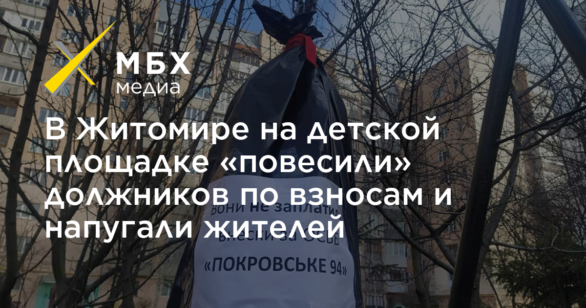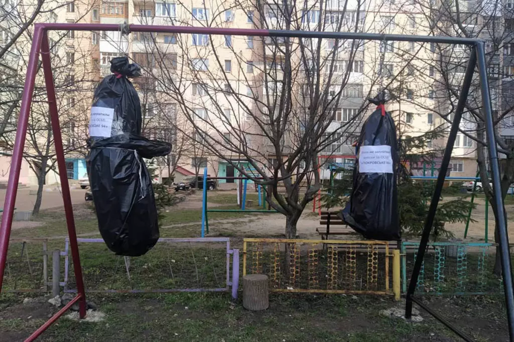 В Житомире на детской площадке неизвестные повесили два черных мешка под видом трупов, прикрепив к ним таблички, на которых было написано: «Они не заплатили взносы в ОСББ [объединение совладельцев многоквартирного дома] Покровское, 94». Фотографии этой инсталляции появились в Instagram-аккаунте zhitomir.info.