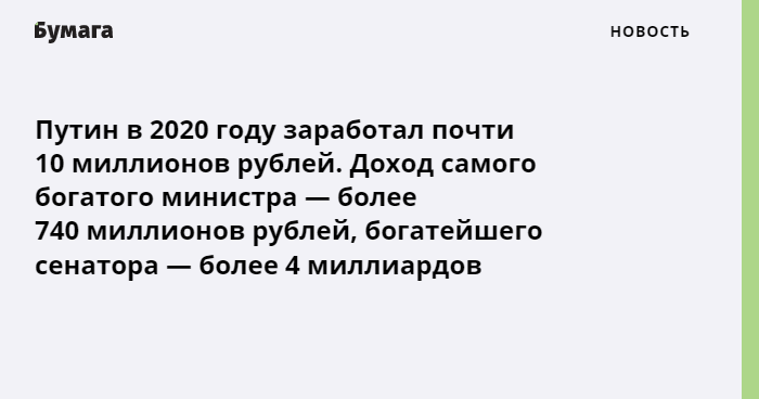 Путин в 2020 году заработал почти 10 миллионов рублей