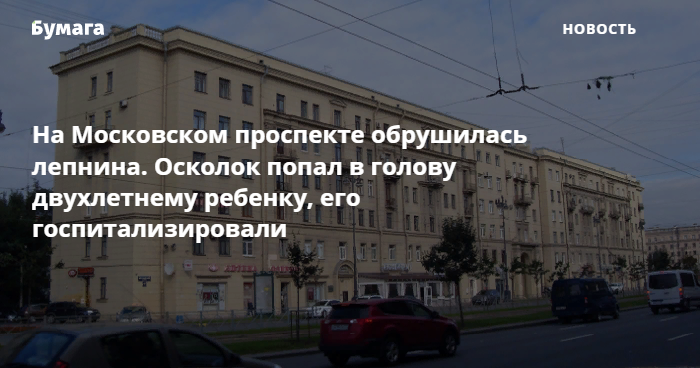 Лепнина рухнула с дома 167 по Московскому проспекту, осколок попал в ребенка. Об этом сообщают 78.ru и «Фонтанка».