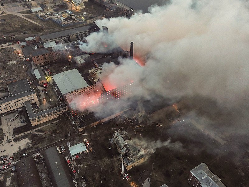 Вид с воздуха на пожар на Невской мануфактуре Красный / Wikimedia 10 апреля 2021 года, Санкт-Петербург — Суд запретил жителю Петербурга Александру Овчинникову, обвиняемому в оправдании терроризма, пользоваться интернетом. Поводом стал его комментарий в группе «Новости RT на русском» в соцсети «ВКонтакте».