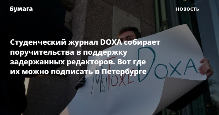 Студенческий журнал DOXA собирает поручительства в поддержку своих задержанных редакторов — ранее им предъявили обвинения по уголовному делу о вовлечении несовершеннолетних в митинги. Подписать документ в Петербурге можно по семи адресам, сообщают в журнале.