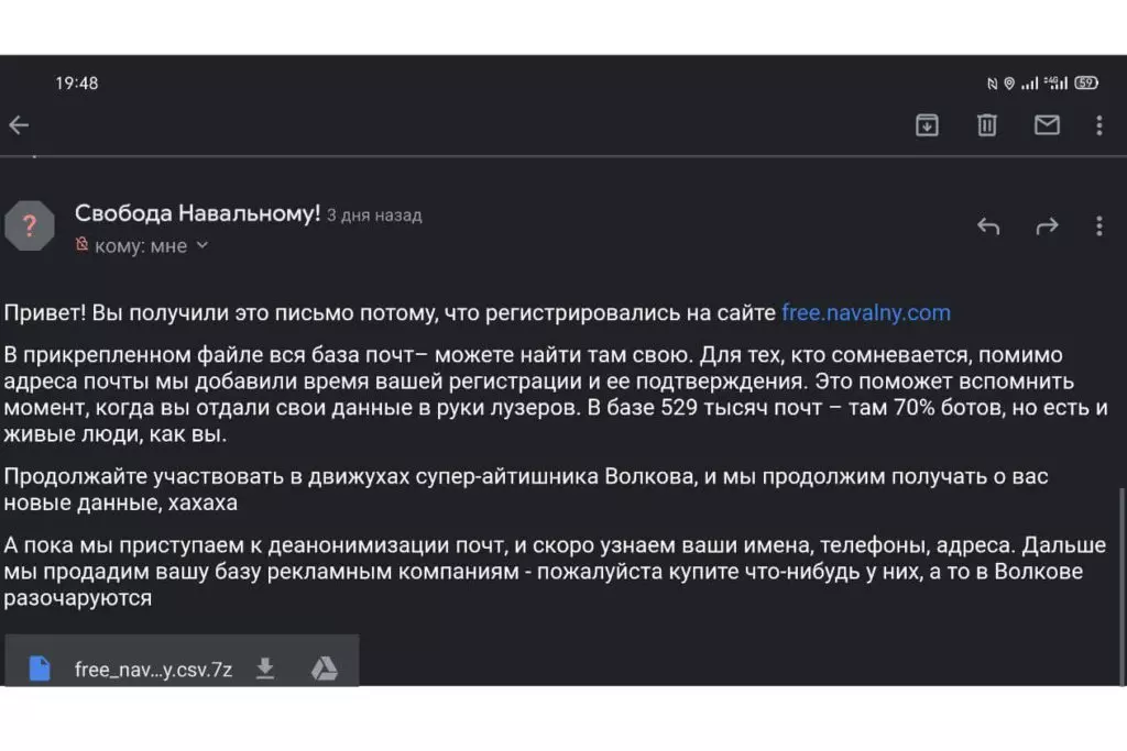 Жертвы взлома получили два письма. «Привет, это Навальный», — значилось в теме первого. К нему взломщики прикрепили файл, в котором находится список из 529 тысяч электронных адресов. «Продолжайте участвовать в движухах супер-айтишника Волкова, и мы продолжим получать о вас новые данные, ха-ха. А пока мы приступаем к деанонимизации почт, и скоро узнаем Ваши имена, адреса, телефоны. Дальше мы продадим вашу базу рекламным компаниям», — говорится в письме.
