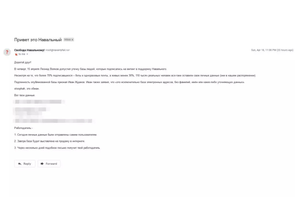 Часть угроз злоумышленники действительно осуществили. Вторым письмом сторонникам Навального пришли их личные данные — ФИО, дата рождения, телефон, адрес и название компании-работодателя. Заканчивается это письмо снова угрозами: «Сегодня личные данные были отправлены самим пользователям. Завтра база будет выставлена на продажу в интернете. Через несколько дней подобное письмо получит твой работодатель».