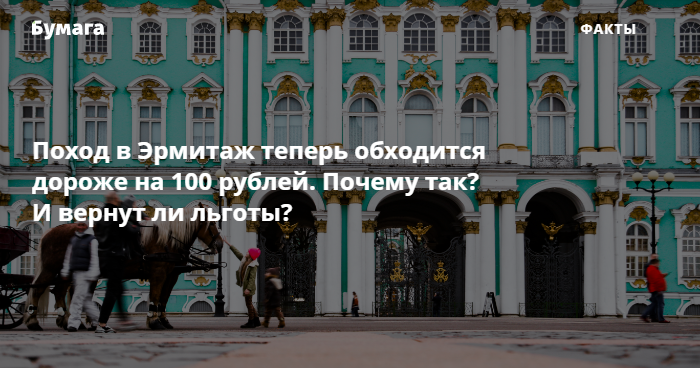 Петербуржцы недовольны изменением ценовой политики. Директор музея Михаил Пиотровский объясняет: из-за тяжелой финансовой ситуации Эрмитаж отменил те льготы, которые ввел сам, и считает, что билеты формально не стали дороже. «Бумага» рассказывает, что известно о ситуации.