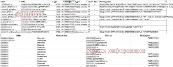 - В этот же день в свободном доступе появились обновлённые базы данных с расширенной информацией, сообщает телеграм-канал «Утечки информации». Сейчас там доступно два Excel-файла, в которых помимо адресов электронной почты присутствует 112 тысяч строк с полями с ФИО, датой рождения, домашним адресом, полом, телефоном, местом работы и учёбы и 52 тысячи строк, содержащих имена, фамилии и номера телефонов.