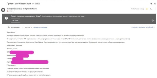 - В команде Навального предложили пострадавшим направлять письма в спам, отмечая, что помимо электронного адреса никакой информации о них нет.