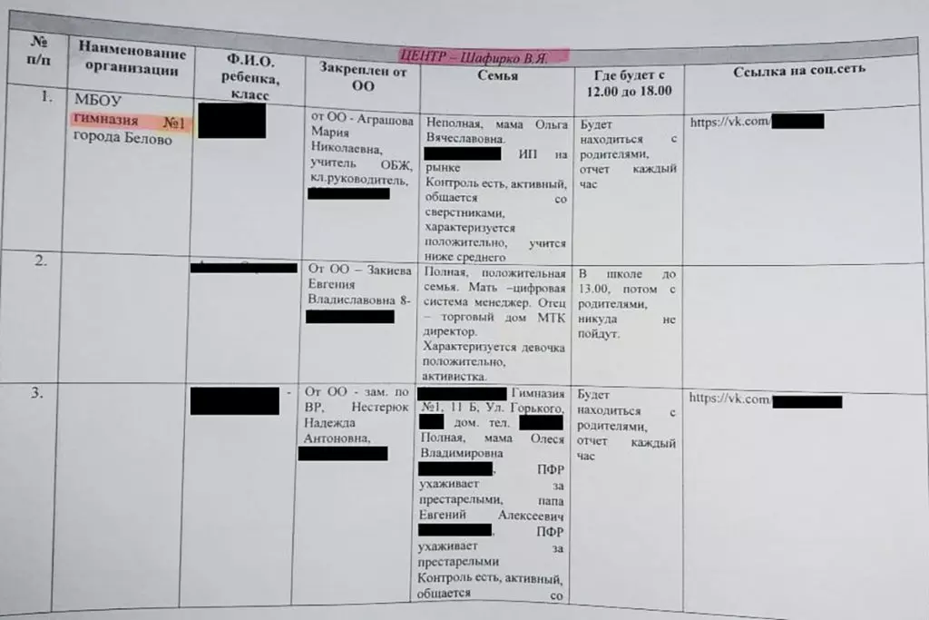 Списки состоят из двух частей. В первой приведены имена учеников школ — всего 48 человек. Там есть как старшеклассники, так и совсем дети — ученики 5-6 классов. В отдельной графе перечислены имена классных руководителей школьников и мобильные телефоны педагогов. Следующая графа — «Семья» — предназначена для данных о родителях учеников. Там приводятся не только их имена и контакты, но и характеристики семей в целом. «Полная, положительная семья», «воспитывается в неполной семье с низким материальным доходом», «воспитывается опекуном (бабушкой), родители отбывают наказание в местах лишения свободы» — лишь несколько примеров таких описаний.