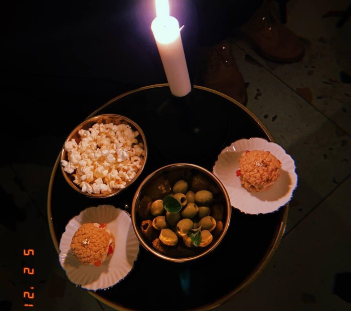 К напиткам гостям подают закуски от шефа Анастасии Толоконовой: антипасти, поп-корн с трюфельным маслом и другие небольшие блюда (их ассортимент регулярно меняется).