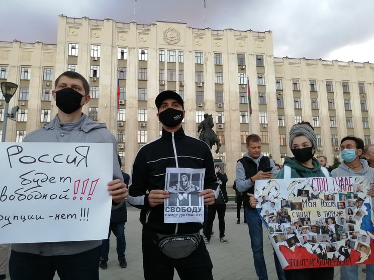 Присутствующие скандировали: "Свободу политзаключенным!", "Навальному - врача!", "Россия без Путина!". В руках участники держат плакаты с надписями: "Свободу политзаключенным!", "Россия будет свободной!", "Свободу Саиду Джумаеву!" (последний - московский студент, который был арестован за драку с сотрудниками ОМОНа на январском митинге в столице).