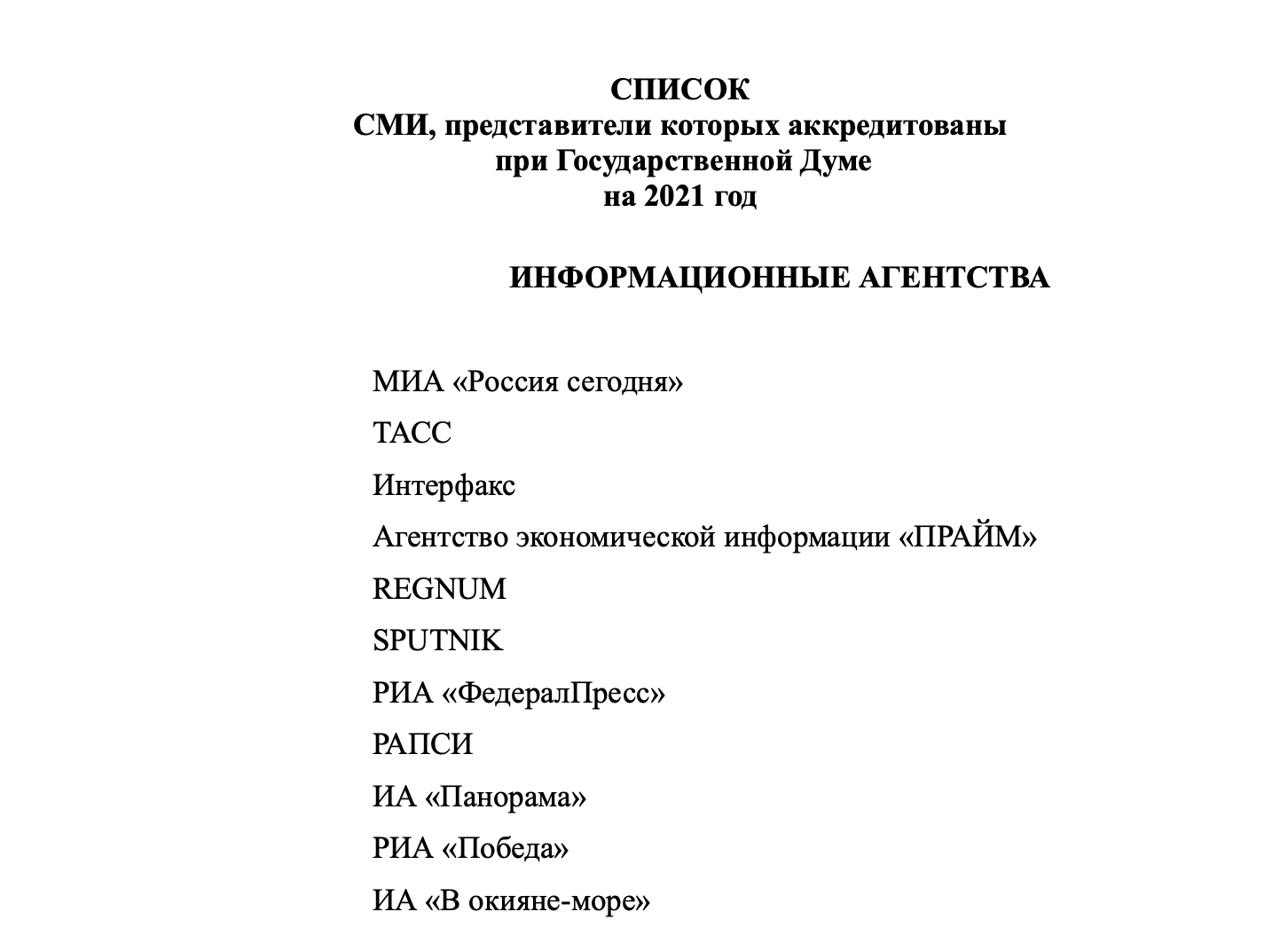Госдума выдала аккредитацию представителям агентства новостей «Панорама». Список СМИ, получивших аккредитацию на 2021 год, опубликован на сайте нижней палаты парламента.