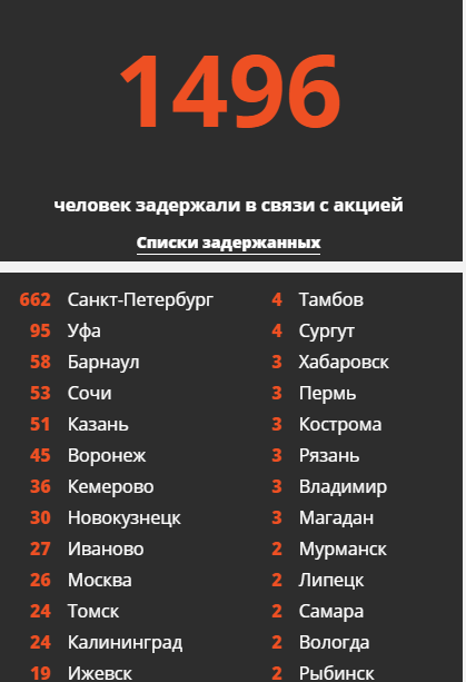 На акции протеста в Петербурге, по данным «ОВД Инфо» на 23:40, задержаны 662 человека. Это больше, чем во всех остальных городах России. В Москве, для сравнения, задержаны 26 человек.