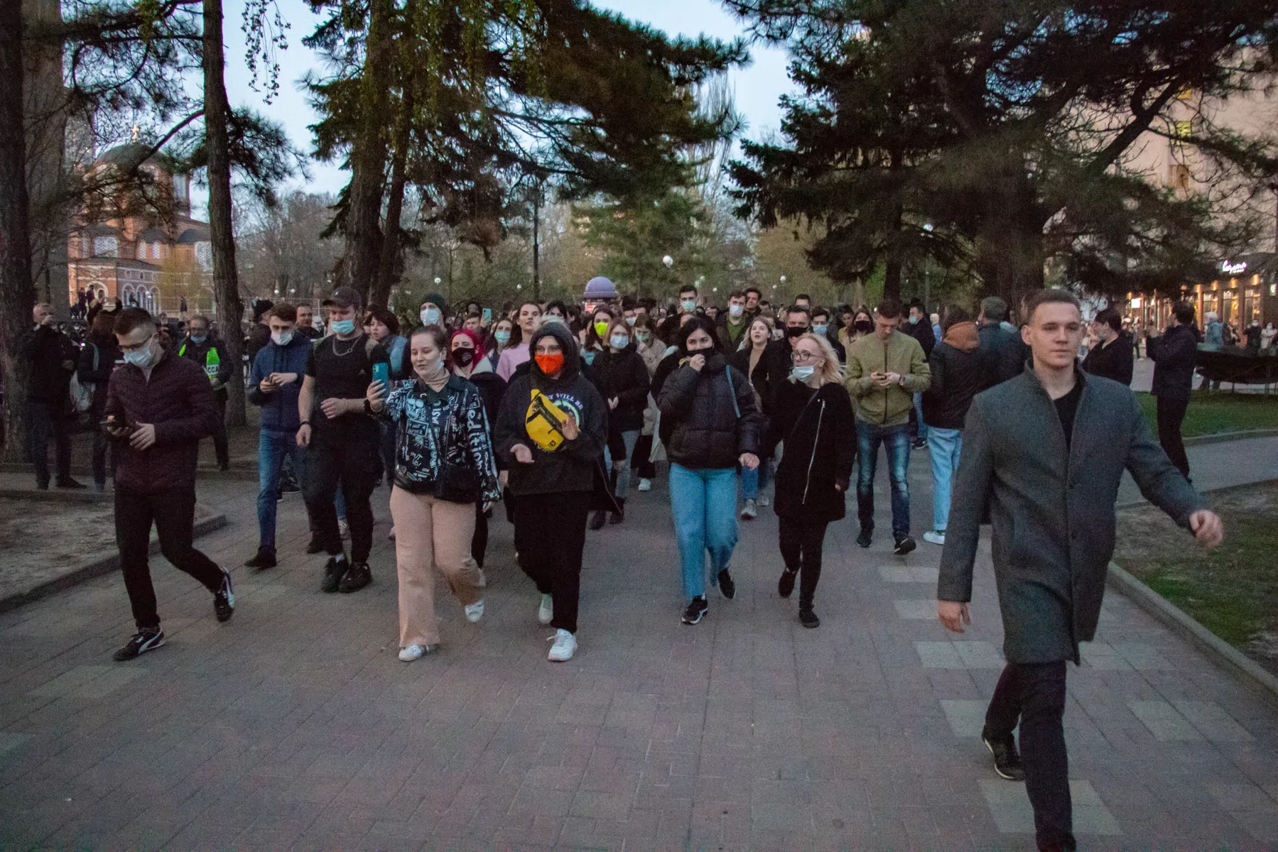 К 19 часам было трудно понять, кто вывел ростовчан на цветущую Пушкинскую — теплый апрельский вечер или Навальный. Заметных групп было две: активисты Народного освободительного движения (НОД) еще с обеда размахивали там флагами цветов Георгиевской ленты; десятка полтора журналистов и фоторепортеров в салатовых жилетах обсуждали историческое ДТП неподалеку, в котором КамАз МЧС зацепил автозак Росгвардии.