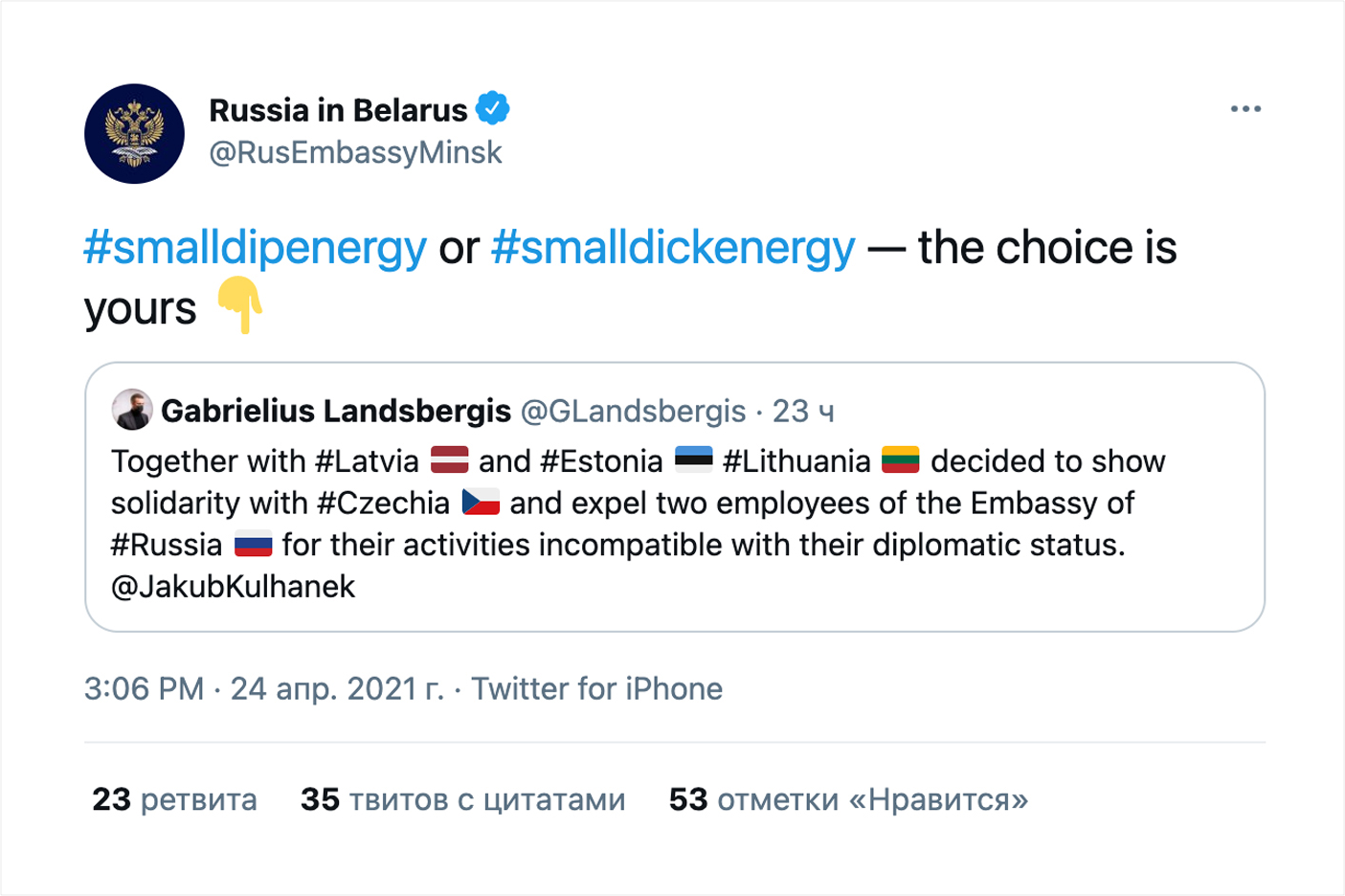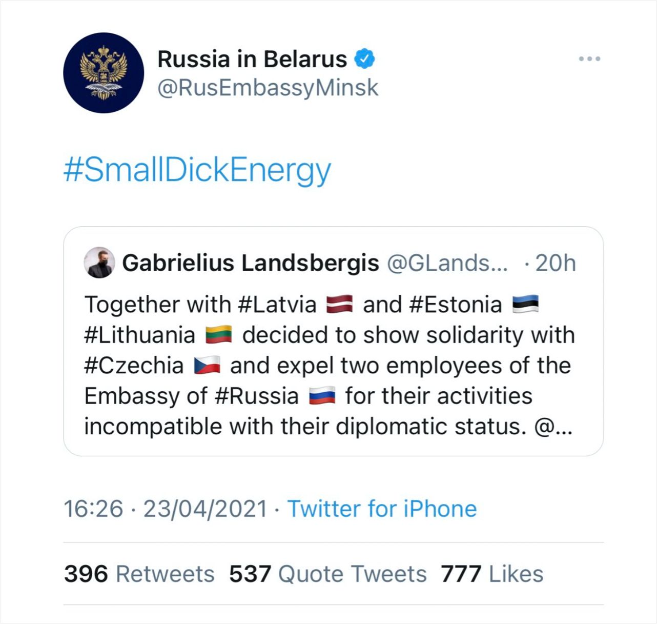 Посольство России в Беларуси в своем твиттере прокомментировало сообщение министра иностранных дел Литвы Габриэлюса Ландсбергиса о высылке российских дипломатов из стран Балтии нецензурным хэштегом #SmallDickEnergy. Примерным цензурным аналогом этого выражения будет «заносчивость, скрывающая неуверенность в себе».