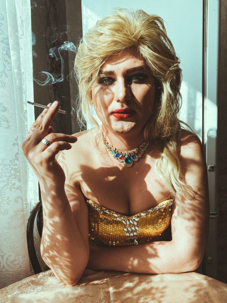Антон, 39 лет, живет в Новосибирске. Работает в салоне мастером ногтевого сервиса. Занимается травести с 2012 года, резидент новосибирского ЛГБТ-бара «Элтон Бар». Его сценический образ — Ольга Леонидовна.