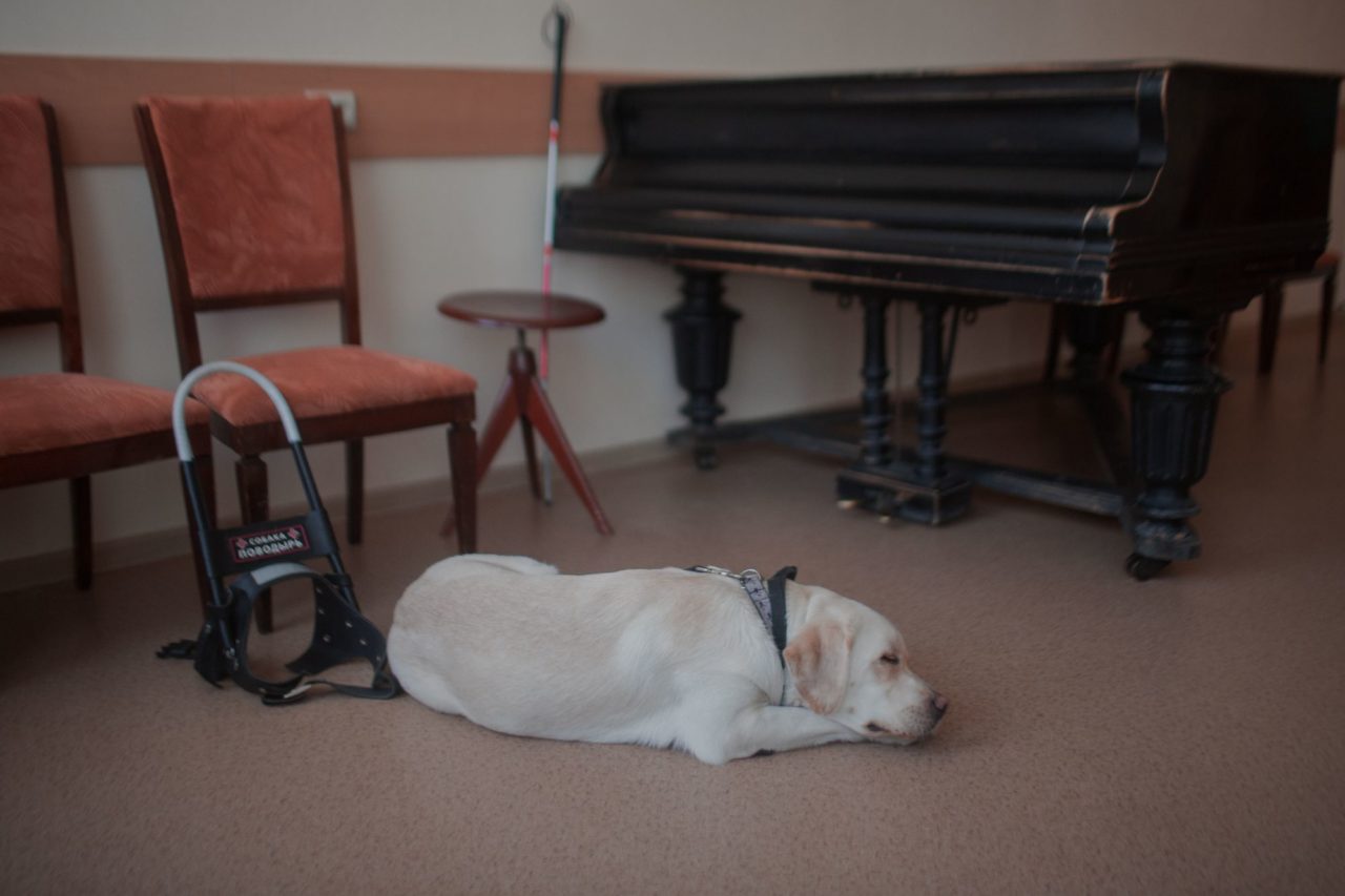 Алиша ждет Максима, пока хозяин ведет занятия по гитареФото: Светлана Булатова для ТД Нет ничего проще, чем как следует заблудиться в городе зрячих. Приходится расспрашивать прохожих, но их объяснения — ребус, который не так-то просто разгадать. Люди называют цвета, этажность зданий, указатели, но никогда — количество ступеней на пути. Максим спрашивает: «Что под ногами там? Щебенка, плитка, асфальт? Сколько шагов до поворота?» Прохожие что-то отвечают, иногда наугад. Проще идти по людям как по компасам, ориентируясь только на направление. В какую мне сторону? Ага, спасибо. И так до следующего человека.