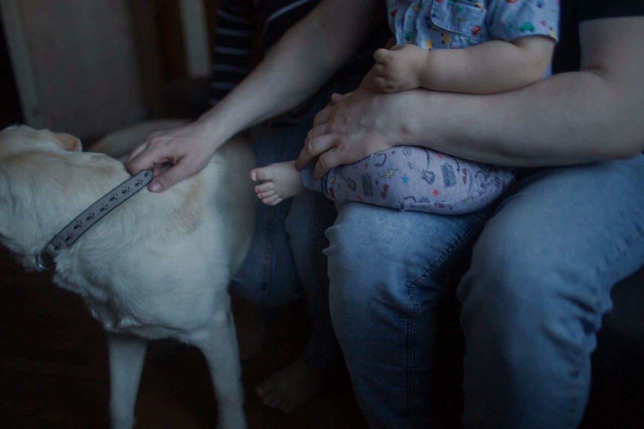 Сын Женя на руках у мамы КатиФото: Светлана Булатова для ТД Каждый день Максим ходит на работу, забегает в магазин, забирает детей из сада. До работы — полтора часа в один конец. Десять минут от дома до станции, потом в метро и еще двадцать минут пешком от Петроградской. С января Алиша вместе с ним. Максим называет ее проводником. Он два года стоял за ней в очереди в центре обучения собак-поводырей. По улицам — асфальтовым, плиточным, бесцветным, состоящим из хлопков дверей, столбиков, поребриков, деревьев, обочин, заросших травой, — они идут очень быстро, так, как незрячий человек может позволить себе идти только со своей собакой. Как ни старайся, чуткая белая трость забирает у движения главную радость — скорость. Но теперь трость крепко зажата в руке над землей. Человека ведет вперед собака.