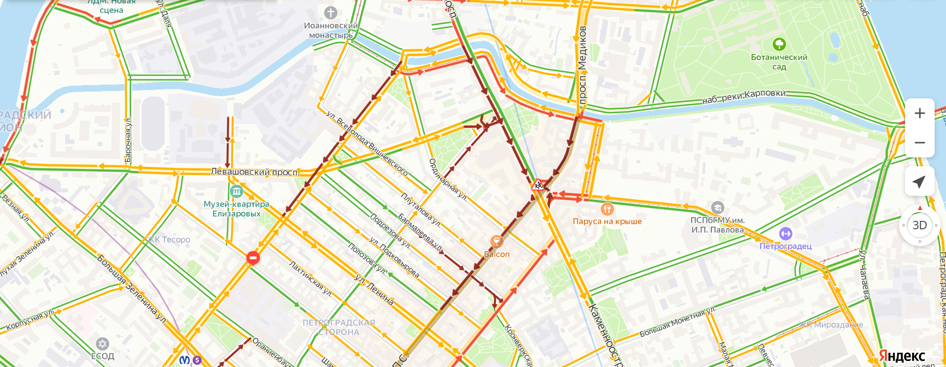 Судя по данным «Яндекс.Карт» на Каменноостровском, Большом и Малом проспектах Петроградской стороны возникли сложности с автомобильным движением. Как уточнили «Бумаге» в администрации Петроградского района, движение не перекрыто — на месте работает регулировщик ГИБДД.