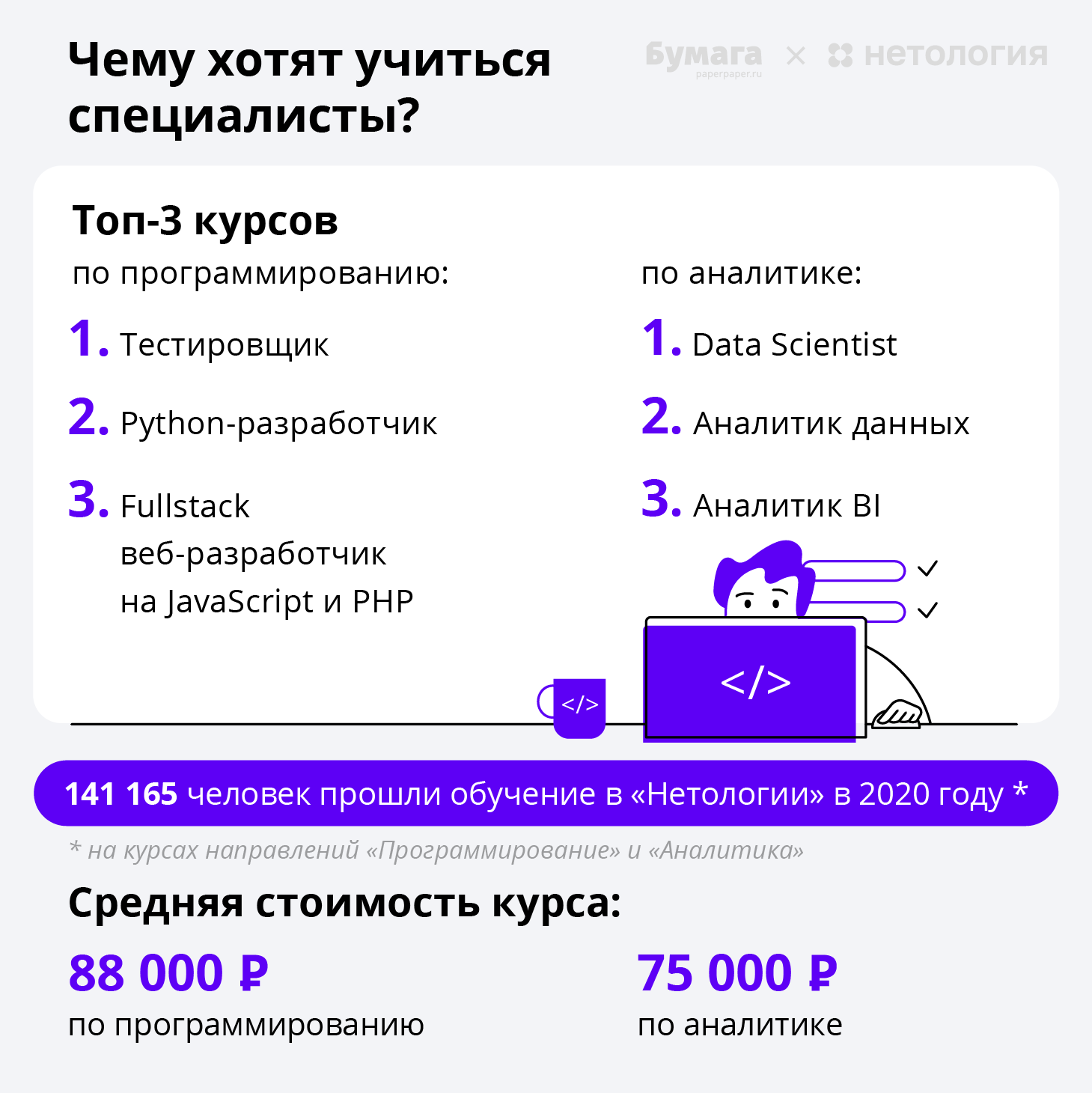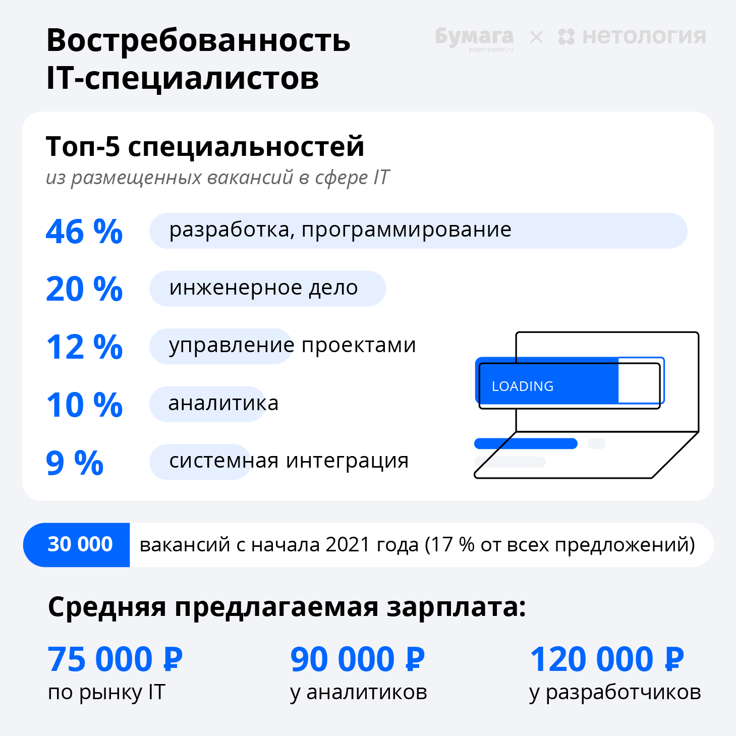 Для партнерского материала с образовательной компанией «Нетология» «Бумага» разобралась, какие профессии востребованы больше всего, сколько работодатели готовы платить сотрудникам и чему обучаются будущие специалисты — листайте инфографику.