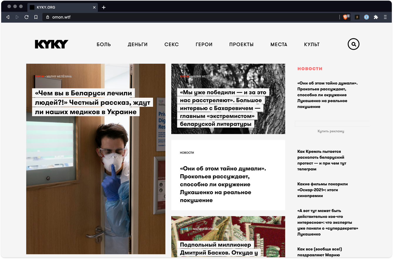 Издание Kyky.org заблокировано в Беларуси почти полгода. Блокировку оно обходит с помощью доменов omon.wtf, nachesy.country и peresident.run