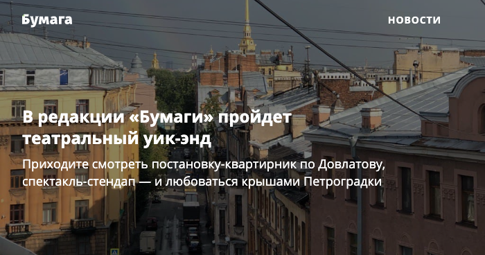 Это спектакль-квартирник о жизни Сергея Довлатова в Петербурге в маленьких очаровательных историях. Постановка основана на записных книжках писателя. Общение с интеллигенцией, сценка с Бродским в закрытом метро, разговоры с дочерью, пьянки — всё это нанизано на главный сюжет постановки: как Довлатова под тьмой невообразимых предлогов годами отказывались печатать в СССР.