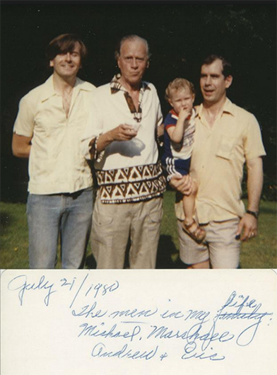 © Предоставлено Эндрю Маклюэном Маршалл Маклюэн в его последний день рождения, 21 июля 1980 года, с сыновьями Майклом (слева) и Эриком (справа). Эрик держит на руках двухлетнего Эндрю Прежде всего