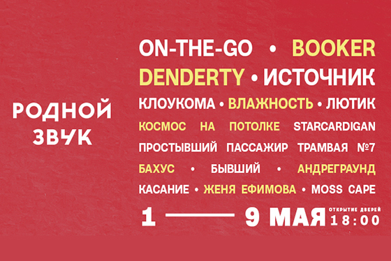 © «Родной звук» С 1 по 9 мая независимый лейбл «Родной звук» совместно с московским барным объединением «Профсоюз» организует ежедневные бесплатные концерты. В программе инди-поп, панк-рэп, электропоп, барокко-поп, синти-поп и spoken word.