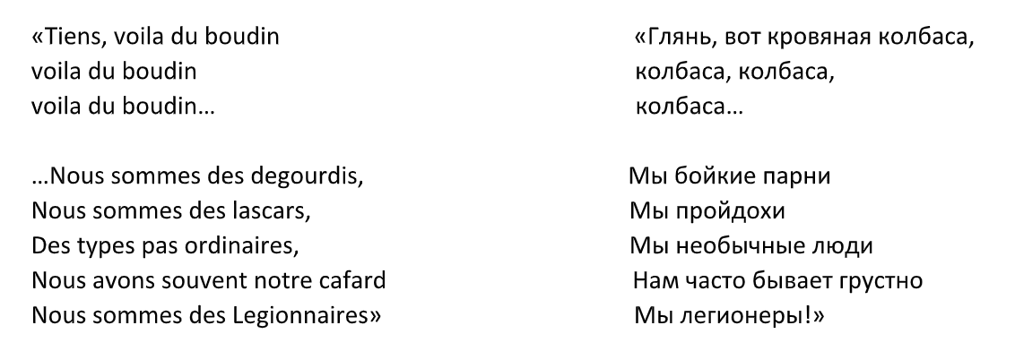 Смешно, но изначально песня была написана на французском языке и исполнялась так более полугода на репетициях. В припеве тогда звучал рефрен из гимна Французского Иностранного легиона «Le Boudin» («Кровяная колбаса»). Текст этого гимна совершенно аномален для официальных, государственных песен. Взвод суровых мужиков, распевающий о кровяной колбасе — это мощно и показывает отличный пример того, как государство поженило патриотизм и нонконформизм, поставив себе на службу девиацию.