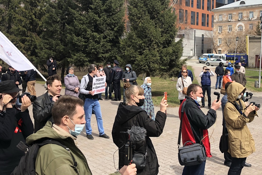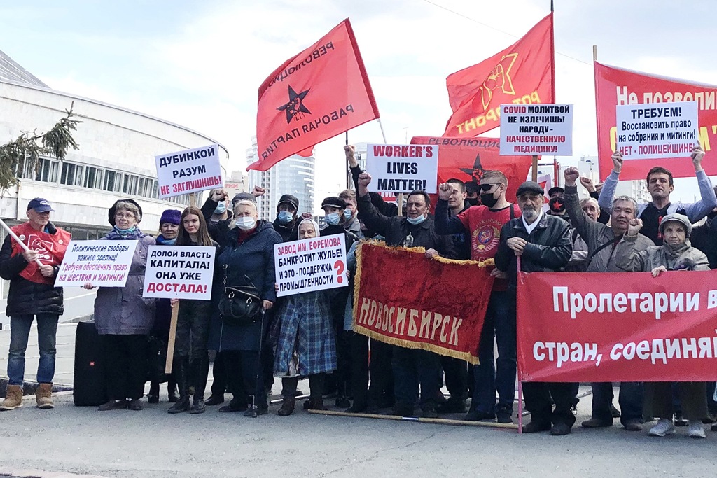 «Губернатор [Андрей Травников] продлил режим повышенной готовности до 31 мая. При этом магазины полны, театры и кинотеатры работают без ограничений, но для граждан выразить свои политические и прочие требования у нас запрет, — напомнил представитель новосибирского отделения РКРП Сергей Крупенько. — Хочу отметить, что это делается не на каждой территории России, в частности сегодня наши товарищи выходят на митинг и демонстрацию в Бийске. А наши губернатор и мэр этого права граждан лишили, и на этом основании сегодня сотни человек в Новосибирской области оказываются под катком репрессий — многотысячные штрафы, угрозы, „дадинская“ статья (УК РФ)».