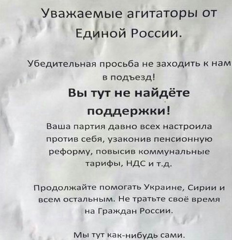 «Ваша партия давно всех настроила против себя, узаконив пенсионную реформу, повысив коммунальные тарифы, НДС и т. д., — сказано в объявлении. — Продолжайте помогать Украине, Сирии и всем остальным. Не тратьте свое время на граждан России. Мы тут как-нибудь сами».