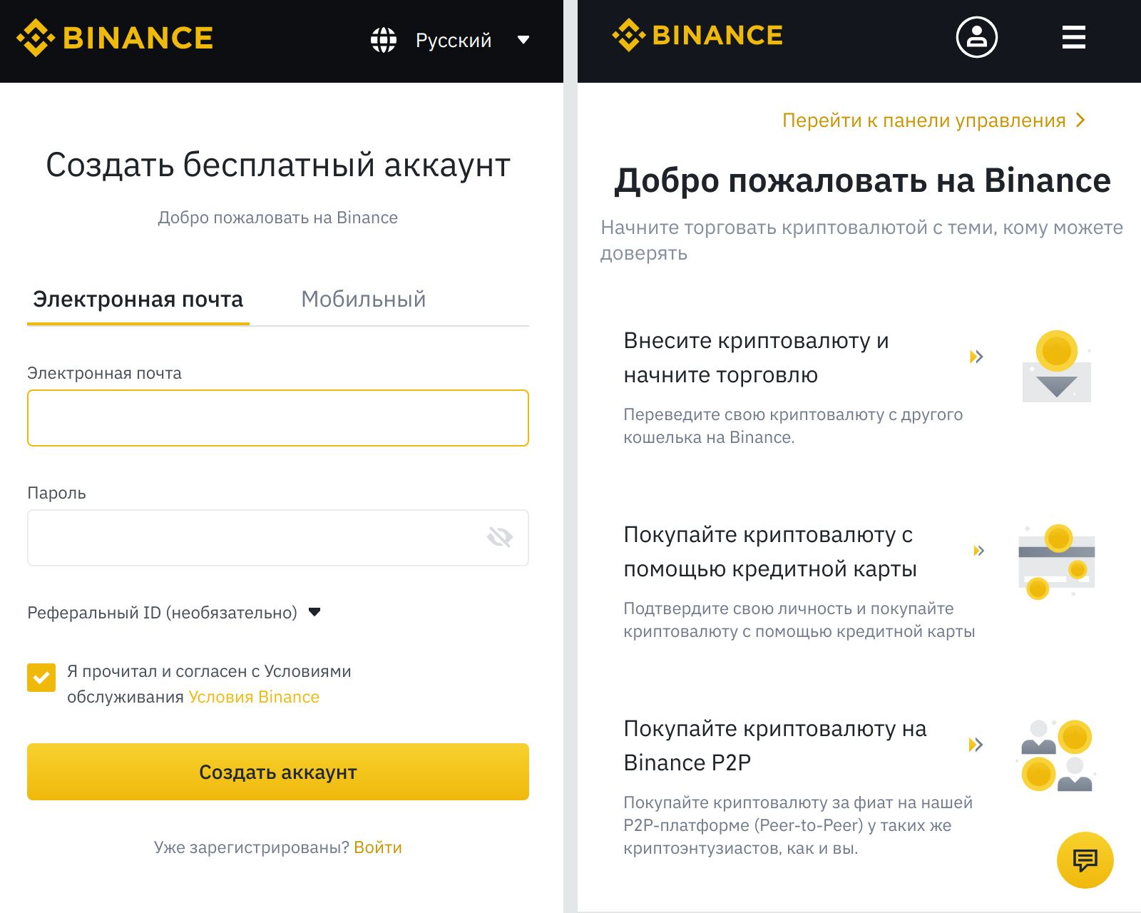 Заведите себе учетную запись на криптообменнике Binance.