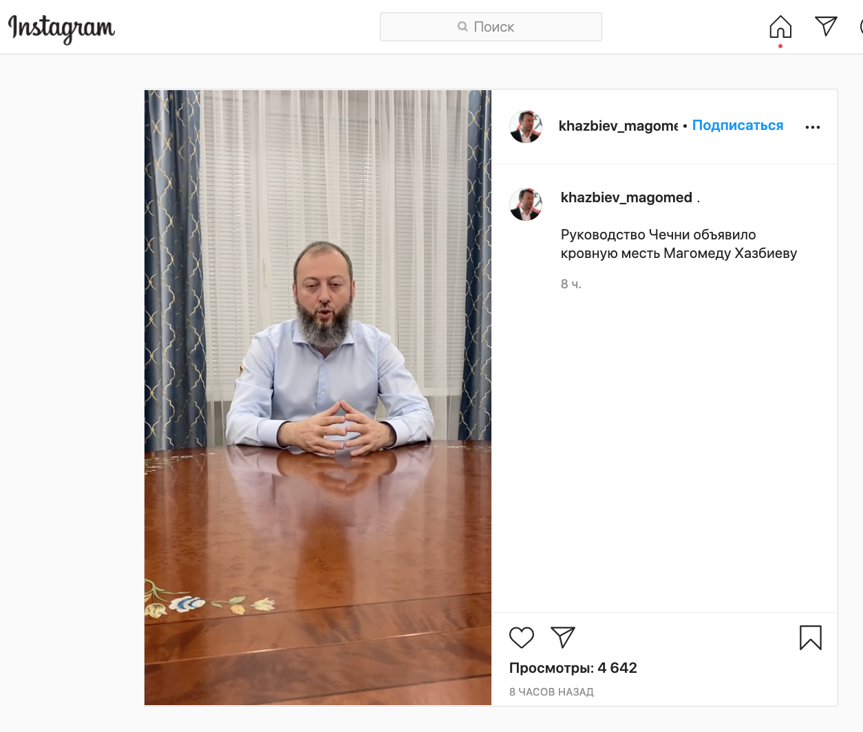 Ингушский оппозиционер Магомед Хазбиев заявляет, что спикер парламента Чеченской республики Магомед Даудов и депутат Госдумы Адам Делимханов объявили ему кровную месть. Об этом политик заявил на своей инстаграм-странице.