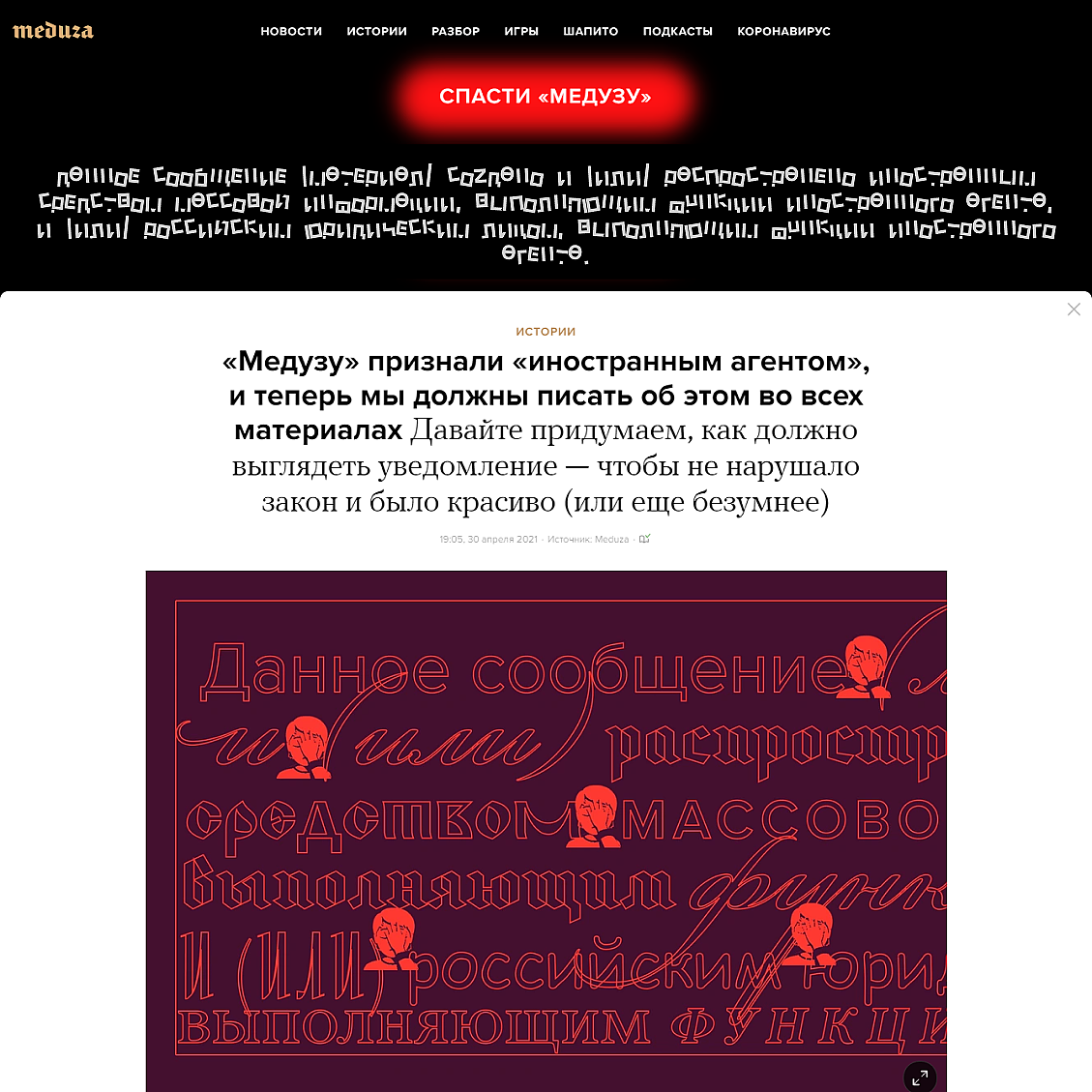 Начиная с 23 апреля наша любимая «Медуза» увешана уродливыми плашками с предупреждением о новом статусе издания. Минюст объявил нас «иноагентами» — и мы, увы, были вынуждены поставить это указание везде, где только можно. Даже перед шапито о золотистом ретривере, вентилирующем себе зад…