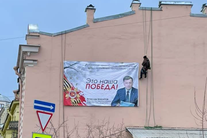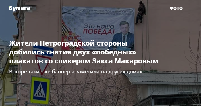 Жители Петроградской стороны добились снятия с фасадов зданий двух плакатов, на которых изображен спикер Закса Вячеслав Макаров и орден Отечественной войны с подписью «Это наша победа». Вскоре после этого четыре таких же баннера появились на других зданиях. Внимание на это обратила «Ротонда».