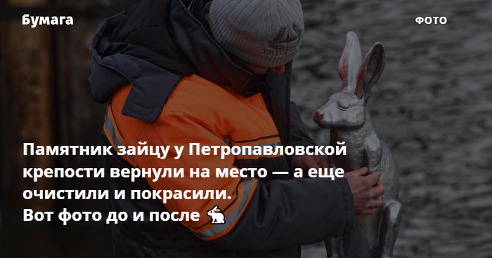 Памятник зайцу у Иоанновского моста, ведущего в Петропавловскую крепость, вернули на место спустя полтора месяца. Об этом сообщает «Мостотрест», сотрудники которого убирали и возвращали объект.