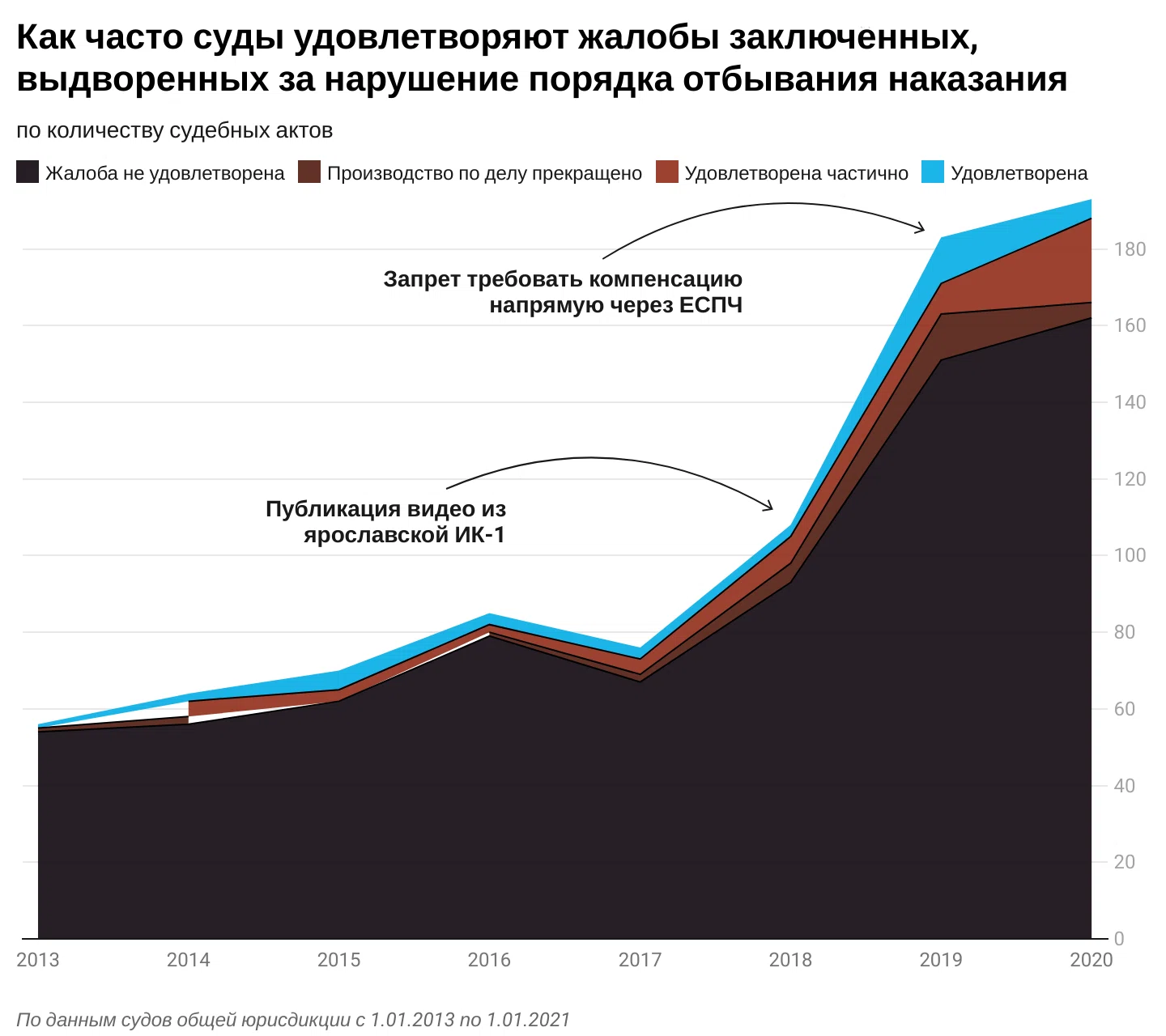 Механизм работает слабо. Количество жалоб с 2019 года на незаконное пребывание в ШИЗО и карцере продолжило расти, а число удовлетворенных исков — упало.