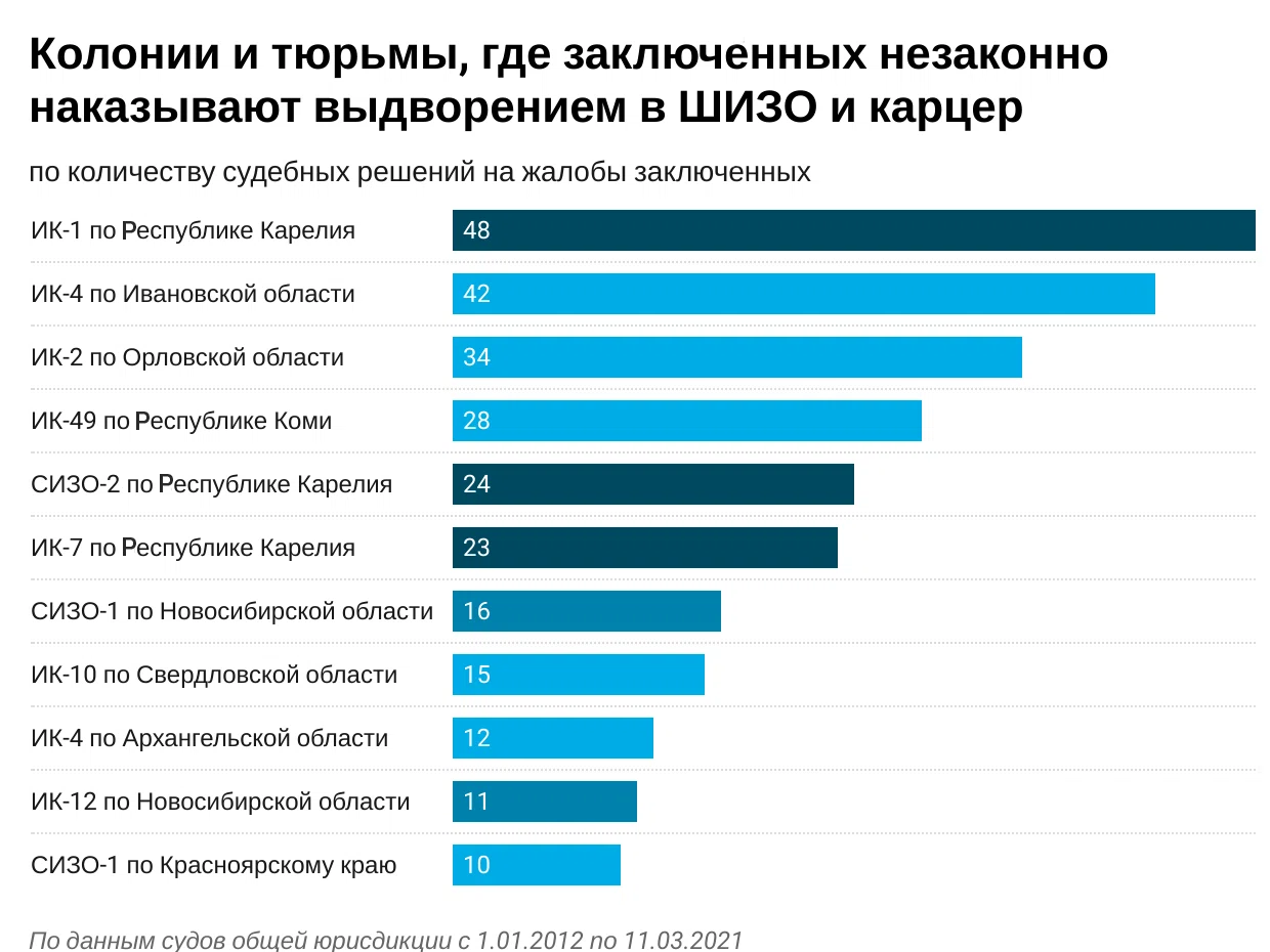 Чаще всего заключенные жалуются на условия пребывания в карельских ШИЗО и карцерах. Возможно, в этих местах заключения действительно более жесткое обращение с «нарушителями». Однако не в каждом учреждении есть реальная возможность написать жалобу. Для человека под стражей, чья жизнь во многом зависит от отношения с сотрудниками администрации, требовать защиты прав в суде может быть опасно или даже невозможно.