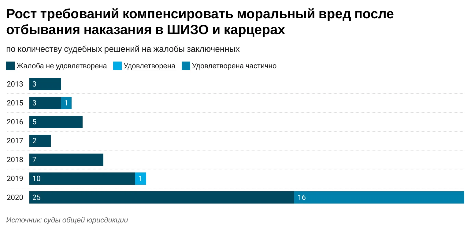 Раньше с требованием о выплате компенсаций заключенные обращались сразу в ЕСПЧ, сейчас — должны идти в местный суд. Половина требований возместить моральный ущерб после пребывания в ШИЗО приходится на 2020 год.