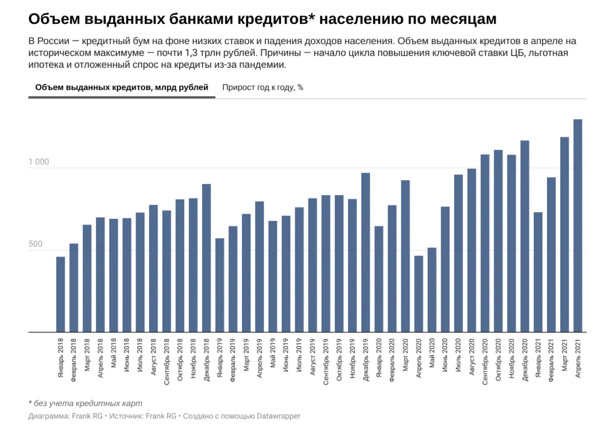 Кроме того, по данным аналитической компании Frank RG, в апреле российские банки выдали кредиты на 1,3 триллиона рублей. Это исторический максимум, подчеркивает компания.