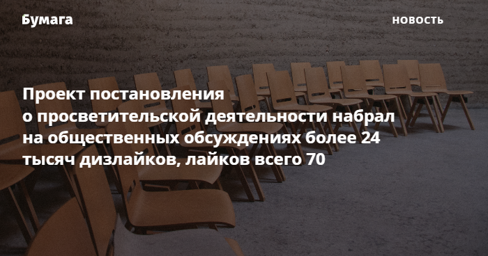 Проект постановления о просветительской деятельности набрал более 24 тысяч дизлайков во время общественных обсуждений и всего 70 лайков. Информация об этом содержится на федеральном портале проектов нормативных актов.