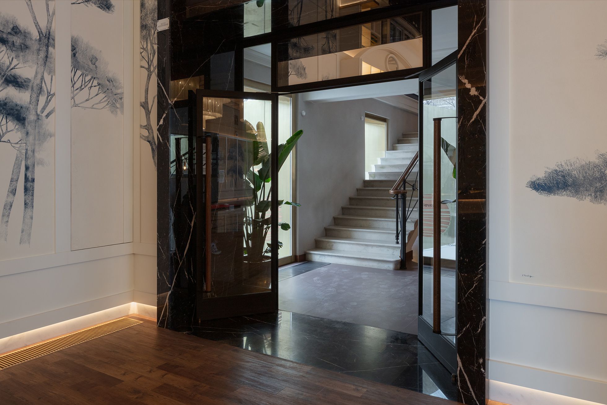 К новым залам ведет винтовая лестница из черного мрамора, которая находится в центре вестибюля и перетекает в стойку ресепшн. Это очень заметный элемент, но немецкое бюро merz merz настояло на том, чтобы поставить ее посередине, поскольку шехтелевский проект выстроен по оси и боковое расположение нарушило бы симметрию.