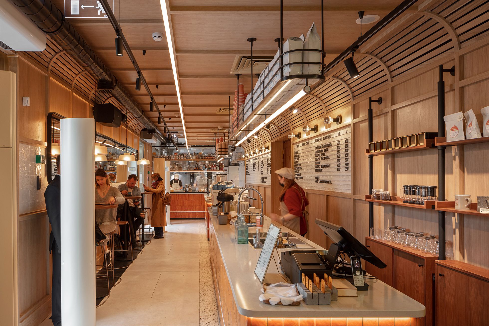 Для еще большей проницаемости в здании предусмотрели входы со всех сторон, в том числе через кофейню на северной стороне ближе к станции метро «Арбатская» синей ветки. В этой части уровень здания опустили, сделав небольшой амфитеатр, где летом собираются выставить столики. Здесь видно одно из немногих заметных расхождений с историческим экстерьером — фрагменты стены повернуты под углом 90 градусов, а за ними располагаются стеклянные двери. По словам Парамоновой, это решение удалось согласовать со специалистами по наследию.