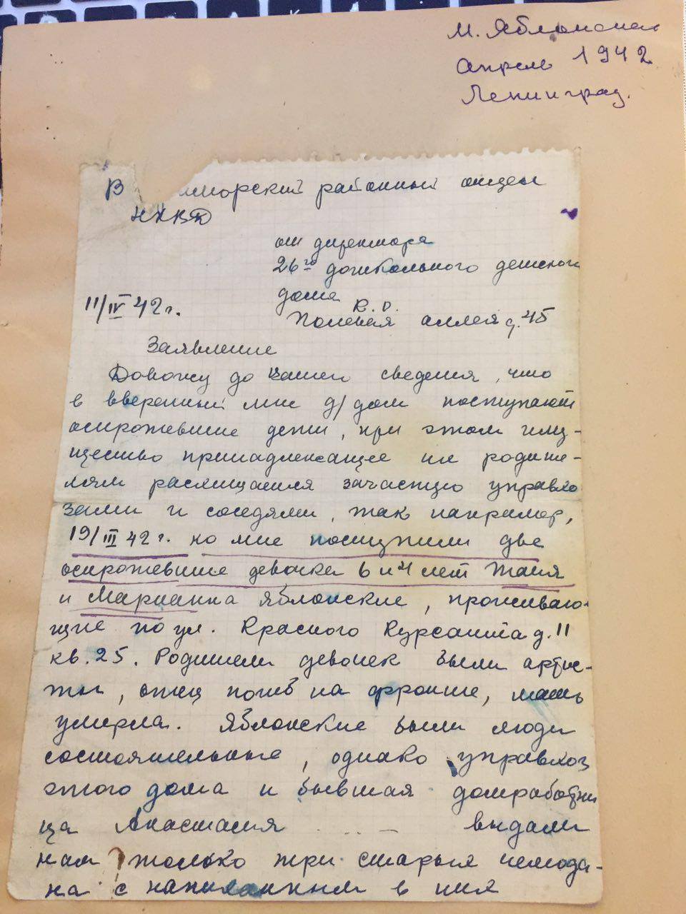 "В районный отдел НКВД от дирекции 26-го дошкольного детского дома. Довожу до вашего сведения, что в вверенный мне детский дом поступили две осиротевшие девочки 6 и 4 лет Таня и Марианна Яблонские, проживающие по ул. Красного Курсанта 11 кв 25. Родители девочек были артисты, отец погиб на фронте, мать умерла. Яблонские были люди состоятельные, однако управляющая дома и бывшая домработница Анастасия ... выдала нам только три старых чемодана..."