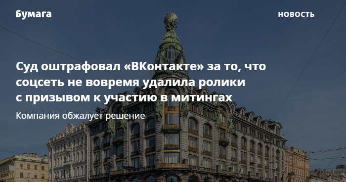 Мировой суд в Петербурге оштрафовал «ВКонтакте» на 1,5 миллиона рублей. Как сообщает 12 мая объединенная пресс-служба судов города, социальная сеть несвоевременно удалила информацию о призывах к участию в январских митингах.