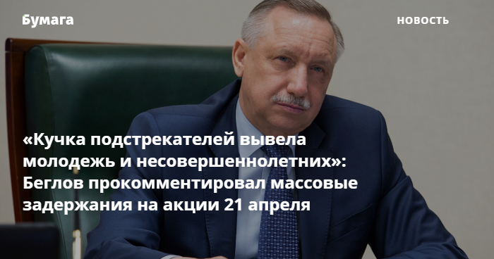 Губернатор отметил, что акция проводилась в нарушение законодательства, а организаторы не подали формальную заявку на ее проведение (организаторы сообщали, что подали уведомления в администрации Москвы и Петербурга). По мнению Беглова, 21 апреля «кучка подстрекателей» вывела на улицу молодежь и несовершеннолетних, что привело к нарушению транспортного сообщения, а также напугало женщин и детей.