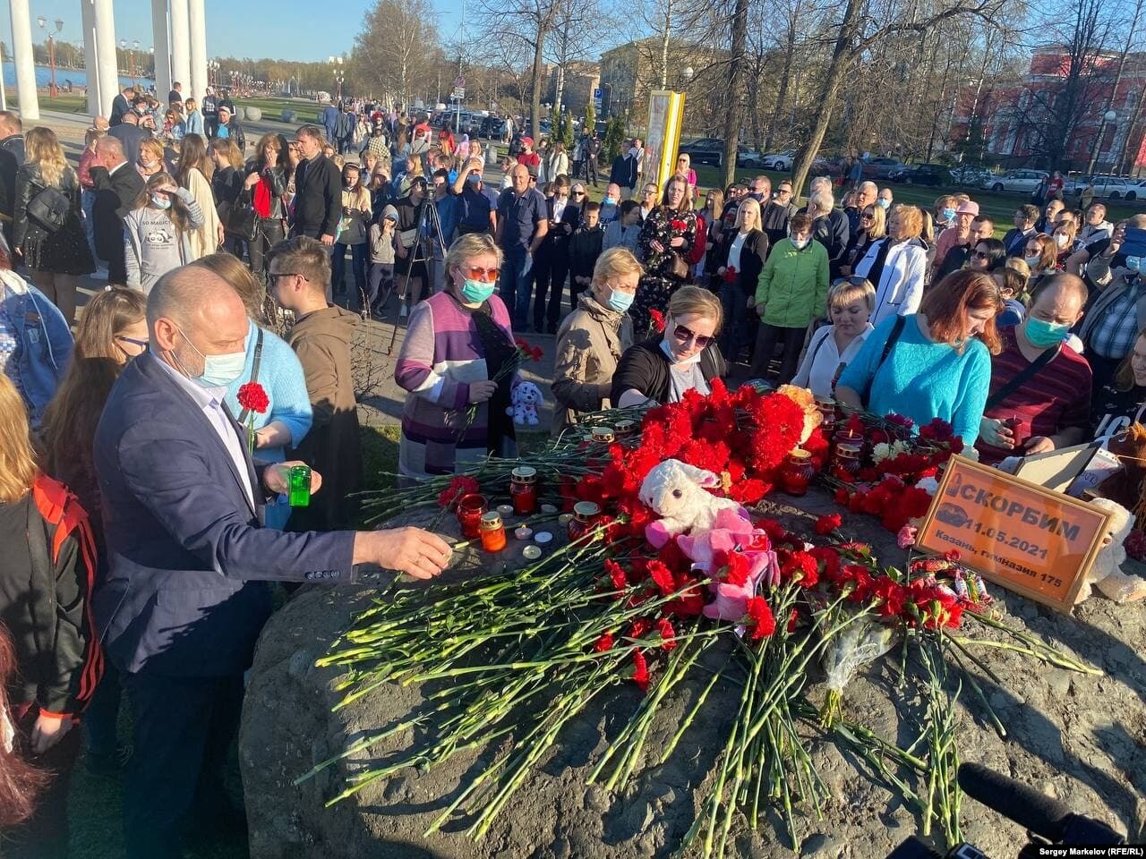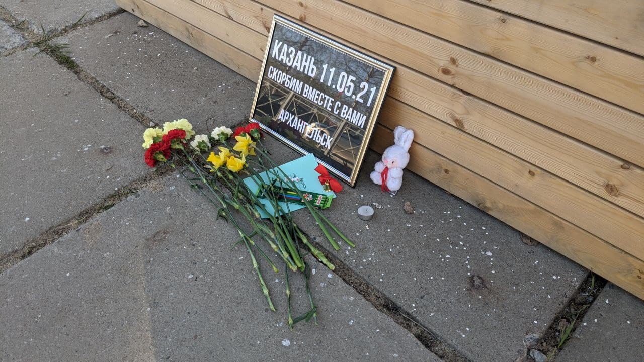 В Архангельске жители также принесли свечи, цветы, игрушки и установили временную табличку в память о жертвах, погибших в гимназии.