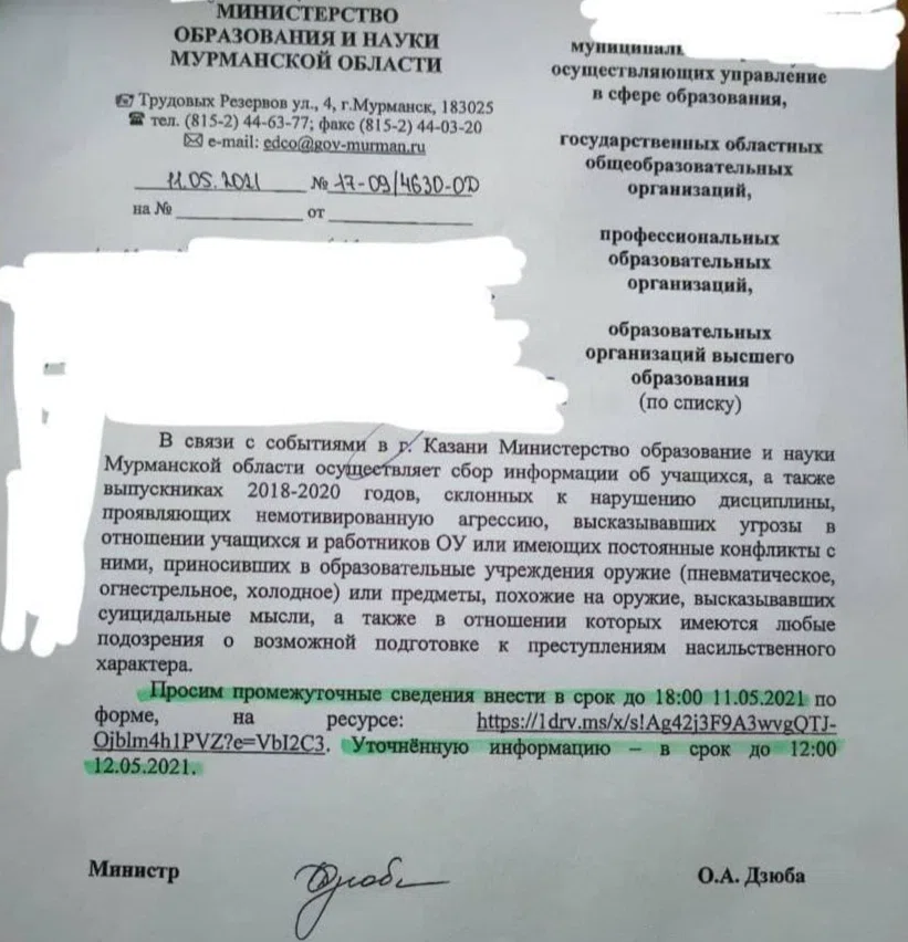 11 мая, через несколько часов после казанского колумбайна, министр образования Мурманской области Ольга Дзюба разослала по учебным заведениям письмо. Из послания, которое имеется в распоряжении редакции, следует, что дети, вызывающие подозрения, а равно и студенты, и даже выпускники прошлых лет, должны быть подвергнуты мониторингу на предмет склонности к противоправному поведению. Данные о подозрительных личностях оказались доступны всем желающим: открытая ссылка на таблицу в облачном хранилище была прямо в тексте письма Дзюбы. А в ней — имена и фамилии молодых людей и их родителей, место работы последних, домашние адреса, телефоны. И… краткие характеристики, так сказать, обоснования для включения в черный список. Например: «курит», «приносил в школу нож», «участник митинга за Навального».