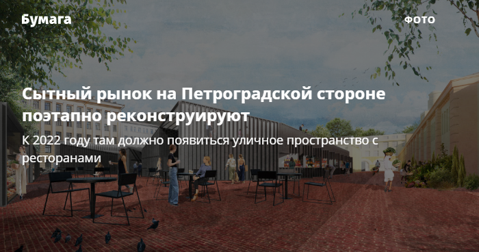 В рамках первой очереди раскроют проходы с Сытнинской улицы на территорию рынка, в результате чего появится новое общественное пространство. Там разместят рестораны с летними террасами, сохранив при этом формат сезонного базара — люди смогут купить корюшку или ягоды на улице. Работы планируют завершить к 2022 году.